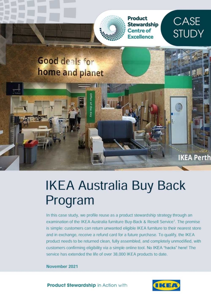 In this case study, we profile reuse as a product stewardship strategy through an examination of the IKEA Australia furniture Buy-Back & Resell Service1. The premise is simple: customers can return unwanted eligible IKEA furniture to their nearest store and in exchange, receive a refund card for a future purchase. To qualify, the IKEA product needs to be returned clean, fully assembled, and completely unmodified, with customers confirming eligibility via a simple online tool. No IKEA “hacks” here! The service has extended the life of over 38,000 IKEA products to date.