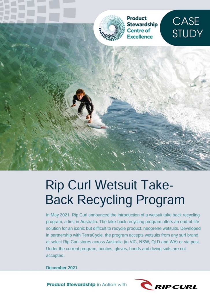 In May 2021, Rip Curl announced the introduction of a wetsuit take back recycling program, a first in Australia. The take-back recycling program offers an end-of-life solution for an iconic but difficult to recycle product: neoprene wetsuits. Developed in partnership with TerraCycle, the program accepts wetsuits from any surf brand at select Rip Curl stores across Australia (in VIC, NSW, QLD and WA) or via post. Under the current program, booties, gloves, hoods and diving suits are not accepted.