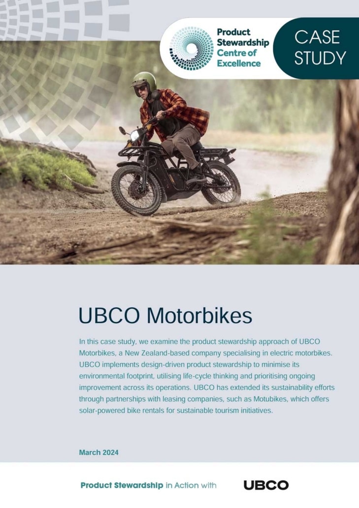 In this case study, we examine the product stewardship approach of UBCO Motorbikes, a New Zealand-based company specialising in electric motorbikes. UBCO implements design-driven product stewardship to minimise its environmental footprint, utilising life-cycle thinking and prioritising ongoing improvement across its operations. UBCO has extended its sustainability efforts through partnerships with leasing companies, such as Motubikes, which offers solar-powered bike rentals for sustainable tourism initiatives.