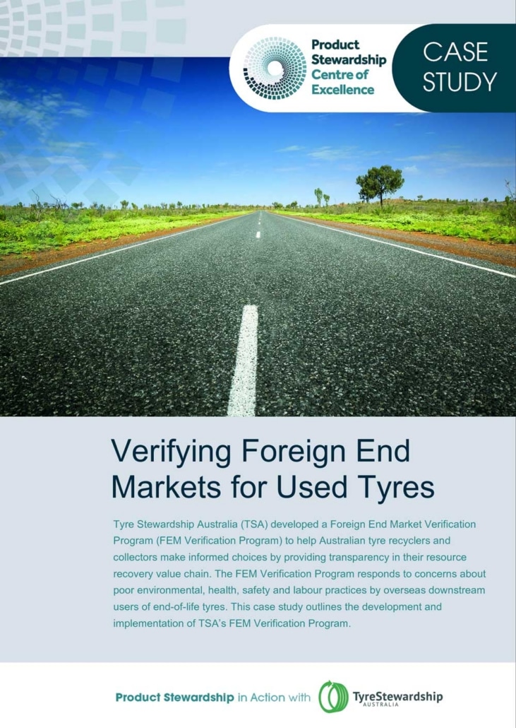 Tyre Stewardship Australia (TSA) developed a Foreign End Market Verification Program (FEM Verification Program) to help Australian tyre recyclers and collectors make informed choices by providing transparency in their resource recovery value chain. The FEM Verification Program responds to concerns about poor environmental, health, safety and labour practices by overseas downstream users of end-of-life tyres. This case study outlines the development and implementation of TSA’s FEM Verification Program.